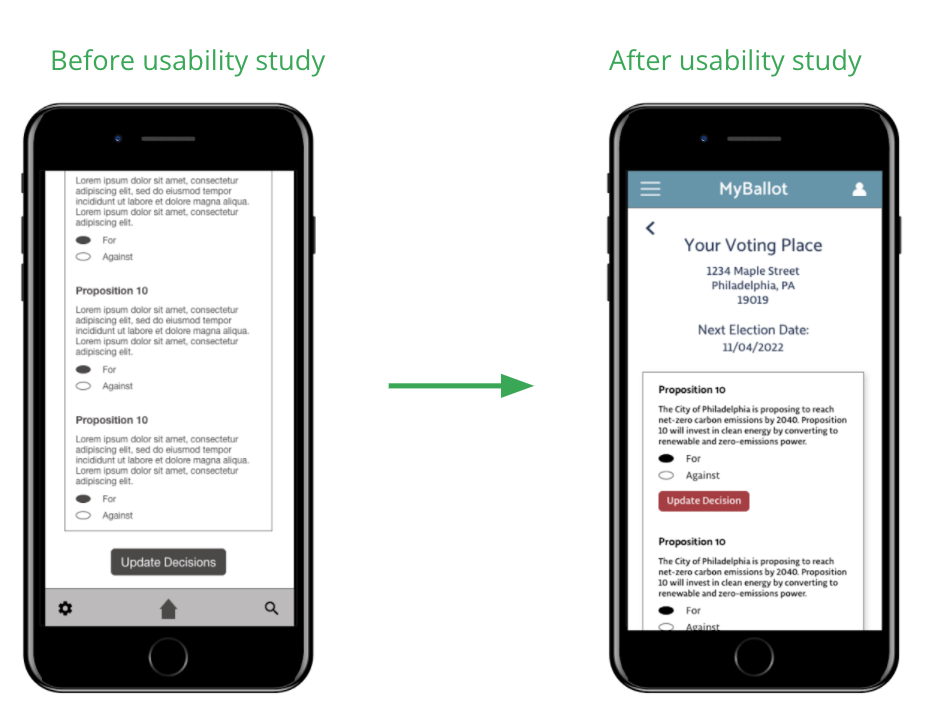 Based on insights from the usability study, I added an “Update Decision” CTA to the Digital Ballot page for each proposition. Before, the Update Decisions CTA was at the bottom of the Digital Ballot Page and would take the user back to all the search results