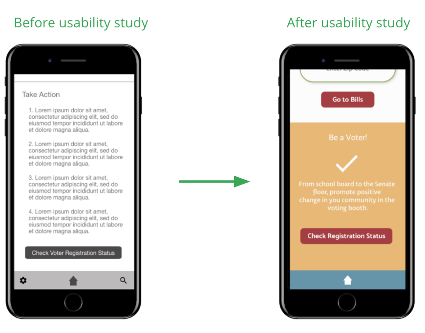 To prepare for usability testing, I created a low-fidelity prototype that connected the user flow of finding upcoming bills, reading more about the bill, and deciding how the user will vote on the bill.